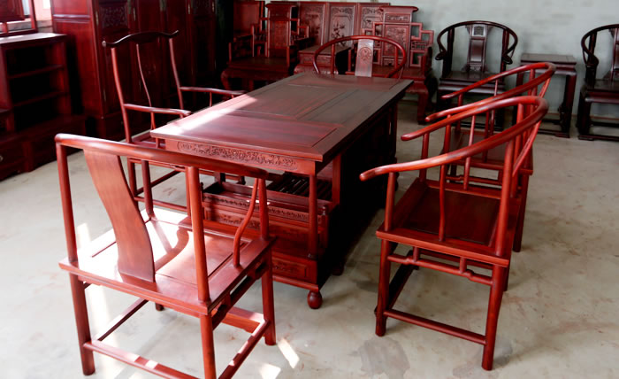 江蘇中尊木業(yè)有限公司書(shū)房系列產(chǎn)品:書(shū)房五件套草龍書(shū)柜、草龍大班枱、卷書(shū)寶座椅,洋花寫(xiě)字枱等。